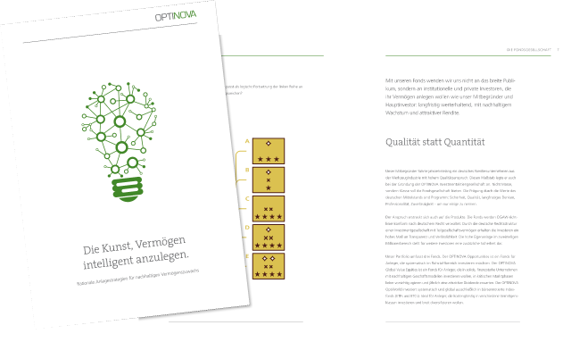 Die OPTINOVA Investment AG ist eine Fondsgesellschaft, die eine wertorientierte Anlagephilosophie verfolgt. Die Muttergesellschaft OPTINOVA Asset Management GmbH bietet Beratungs- und Serviceleistungen für institutionelle Finanzdienstleister und private Großinvestoren, die Vermögen nachhaltig und wertorientiert anlegen möchten. Sicher eine der intelligentesten Arten, Vermögen anzulegen. Denn diese Anlage setzt auf Köpfchen statt auf Bauchgefühl, auf rationale, nachvollziehbare Fakten und Prozesse statt auf Spontanität oder einen guten Riecher. Mit Hilfe eines integrierten Intelligenztests kann der Leser der Broschüre herausfinden, ob diese Anlagestrategie das Richtige für ihn ist.