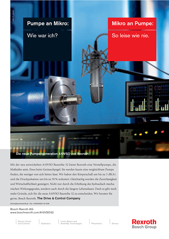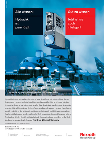 Rexroth liefert hochwertige technische Komponenten wie Hydraulikpumpen, Steuerelektronik oder Kühlgeräte, die man nicht mehr zu sehen bekommt, wenn sie erst einmal eingebaut sind: in Zügen, Baggern, Hebebühnen, Riesenrädern, Windkraftanlagen und anderen Geräten oder technischen Anlagen. Meist waren die Produkte für ein Shooting nicht verfügbar. Man konnte uns lediglich nüchterne Produktabbildungen zur Verfügung stellen. Um die Produktvorteile zu visualisieren und ihnen einen emotionalen Anstrich zu geben, arbeiteten wir mit Composings. Diese international eingesetzte Anzeigenkampagne wurde in zahlreichen Ländern geschaltet und deshalb in die unterschiedlichsten Sprachen adaptiert - darunter in Russisch und in Chinesisch.